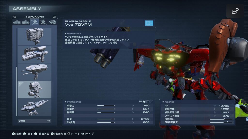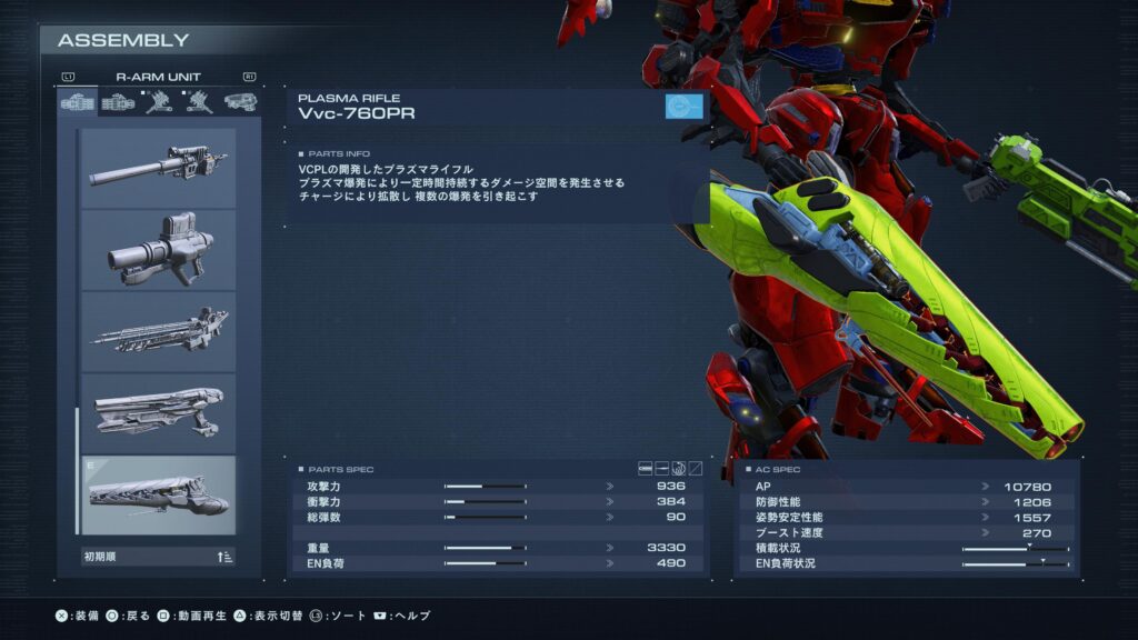 右手武器は、マシンガンが好きだったんだけど、射撃ボタン押しながら敵の攻撃を避けつつ肩武器使う……にたいな戦闘が苦手だったので、一発一発撃てるタイプの方が自分には合ってるかなと。