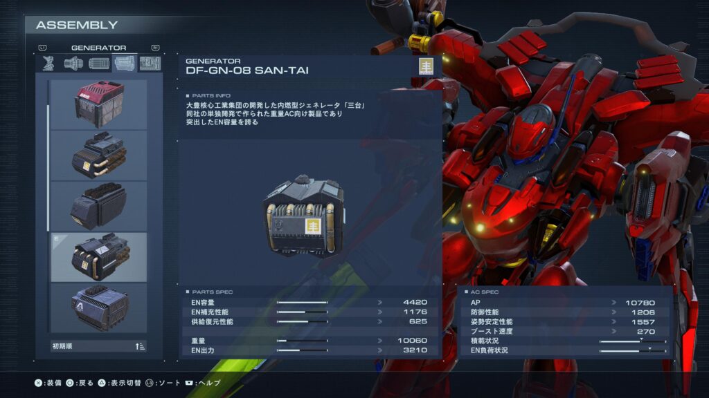 なので、このジェネレーターを積んで、武器もある程度の重量のを使うとすると、軽量足だと積載量が無理。