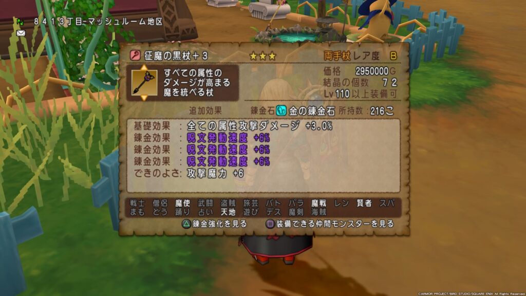 征魔の黒杖には「全属性ダメージ+3%」が付いているので攻撃魔力差を考慮しても僅かに火力面では劣るが、手数を重視するならこちらも十分に選択肢に入るだろう。