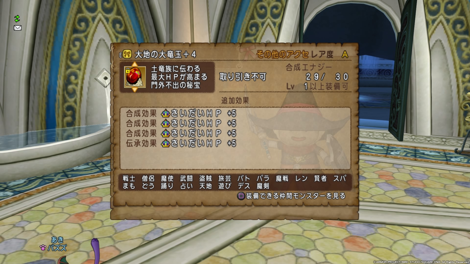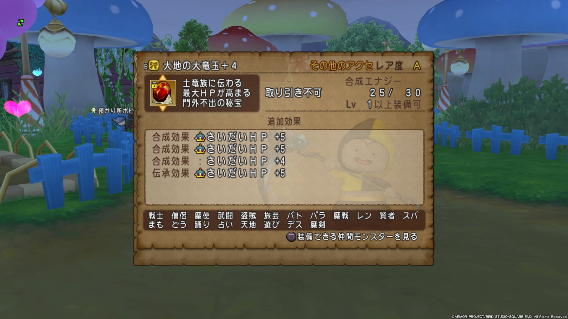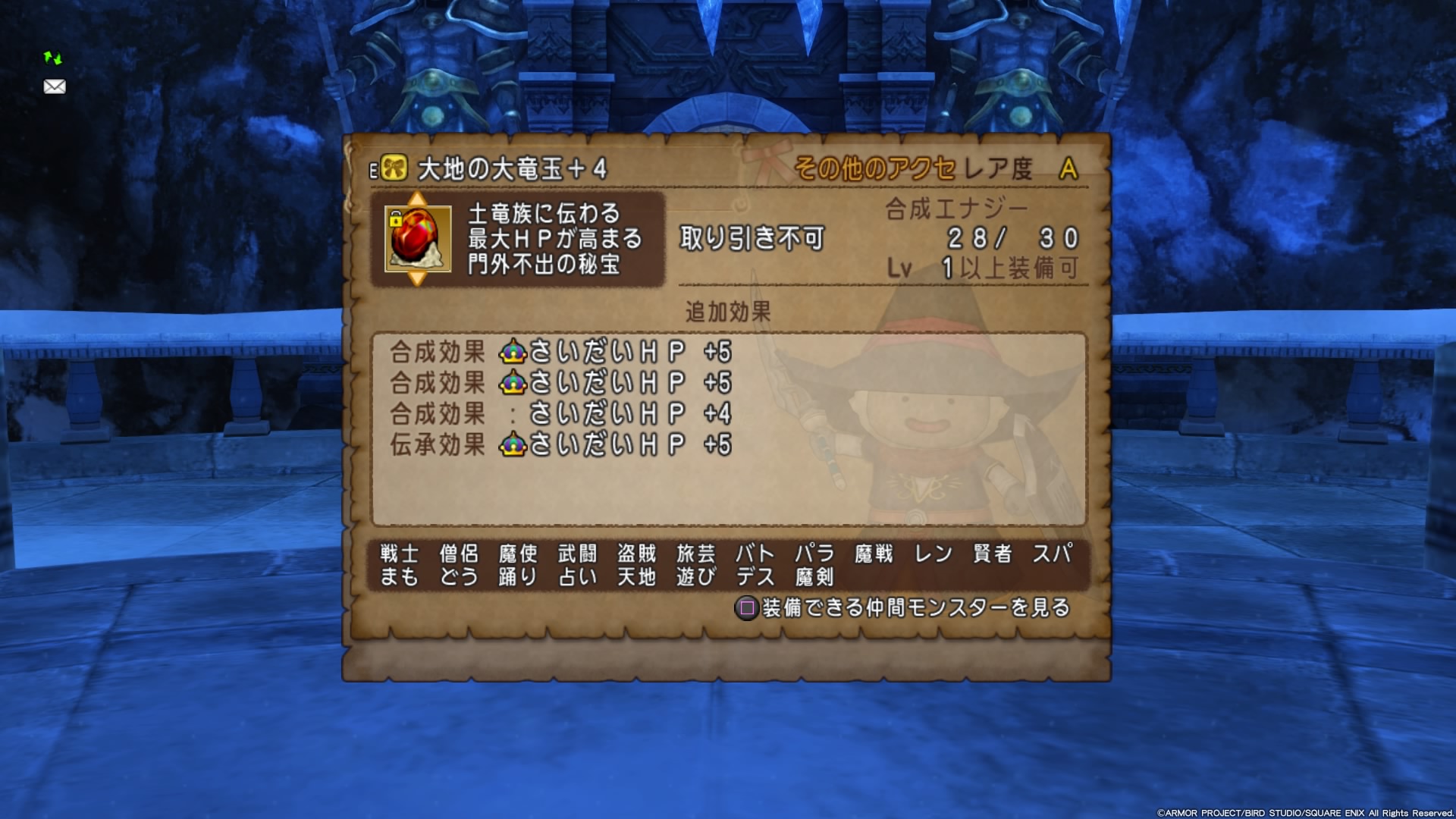 基本効果で最大HP30アップ。合成・伝承合成で最大HP20アップの、合計で、HP50アップできる大地の大竜王。