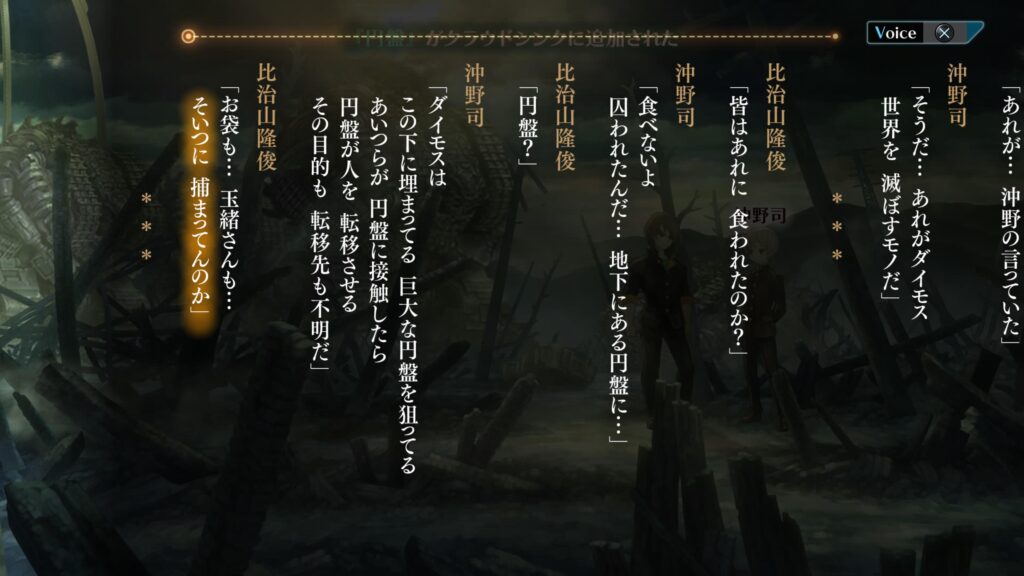 「ダイモスはこの下に埋まってる巨大な円盤を狙ってる。あいつらが円盤に接触したら、円盤が人を転移させる。その目的も転移先も不明だ。」