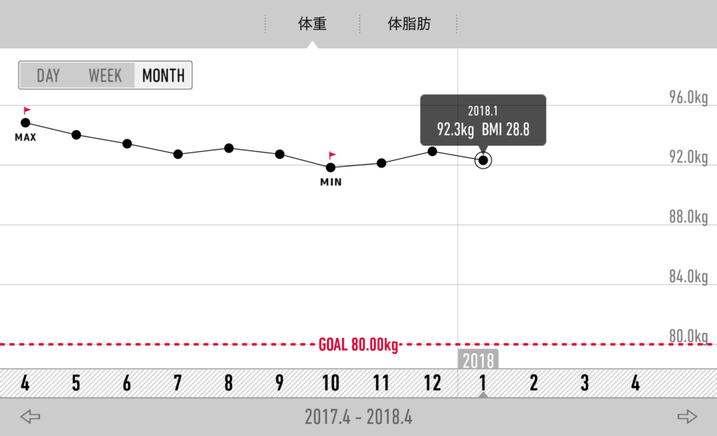体重計測始めてからのMaxが98キロなので、13キロ減らす算段。