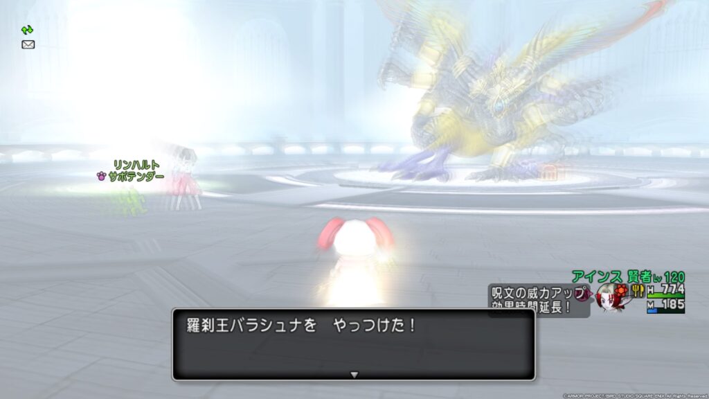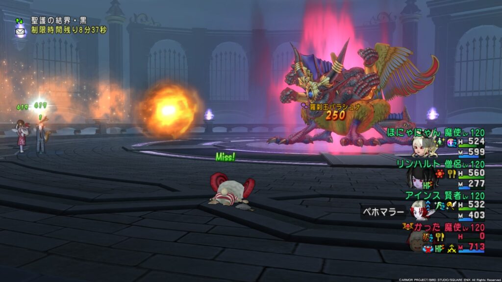 「破滅のテンペスト」は、バラシュナの周囲だけが安全地帯の全方位型の技。文字が出た瞬間ダッシュしてバラシュナに突っ込んで回避するのだが、全然間に合わない。