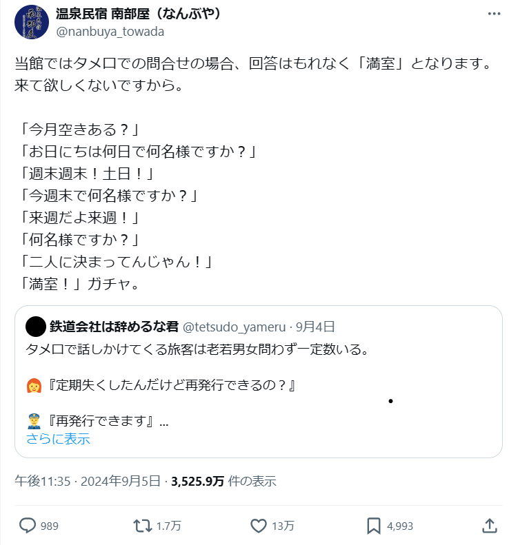 「満室!」ガチャ。 https://t.co/72fdmLkJHy— 温泉民宿 南部屋(なんぶや) (@nanbuya_towada) September 5, 2024