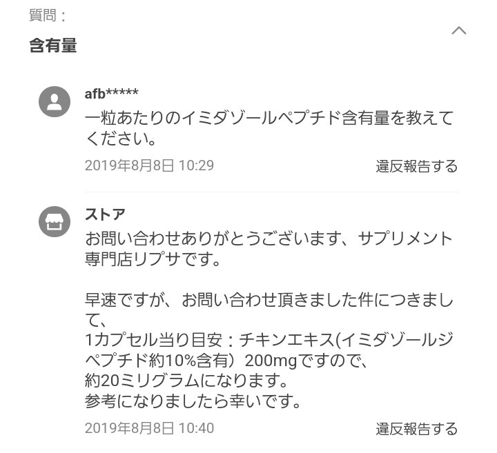 前回買ったイミダゾールジペプチドのサプリは、1カプセルに50mgイミダゾールジペプチドが入ってて、90カプセル入り。これで2000円。